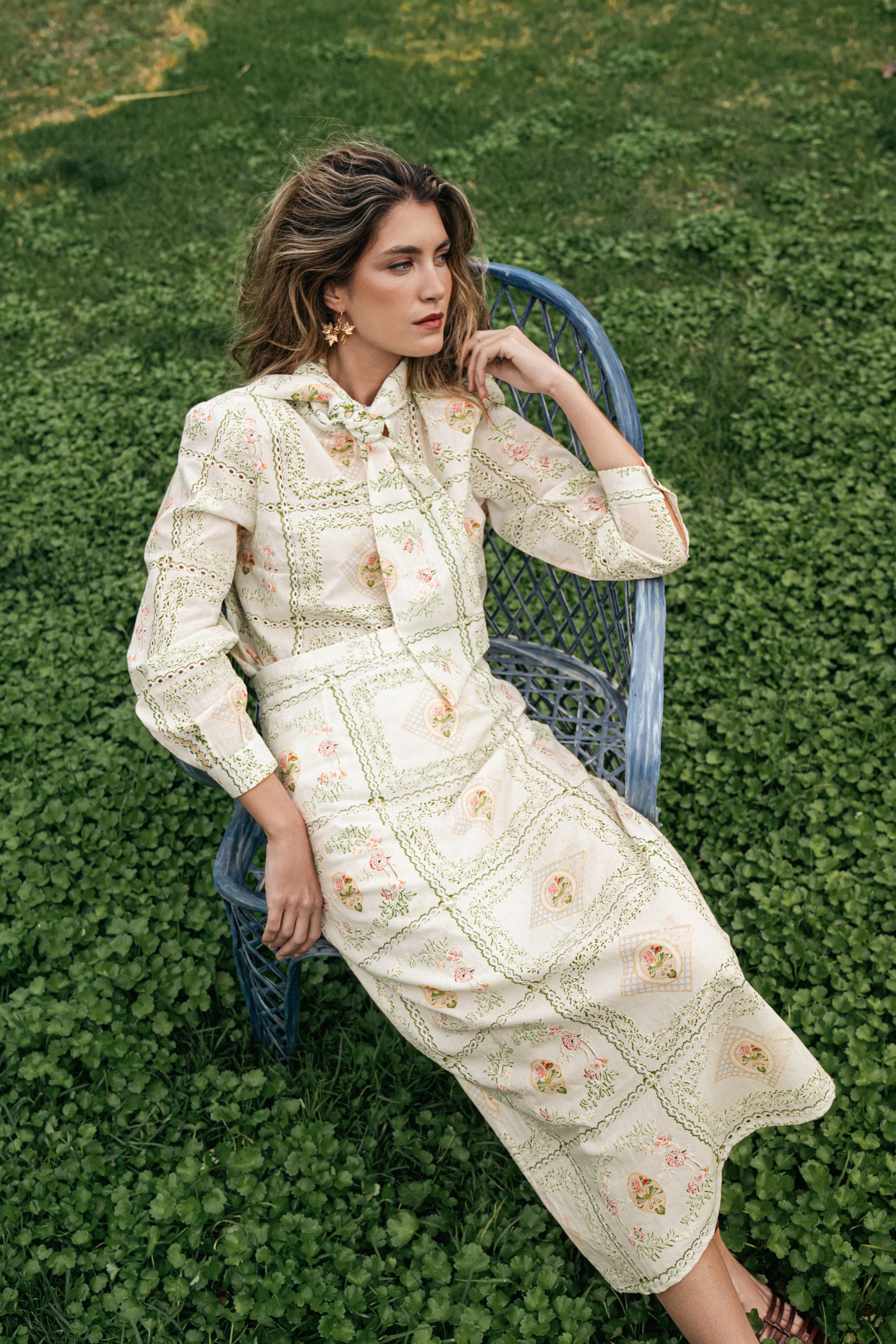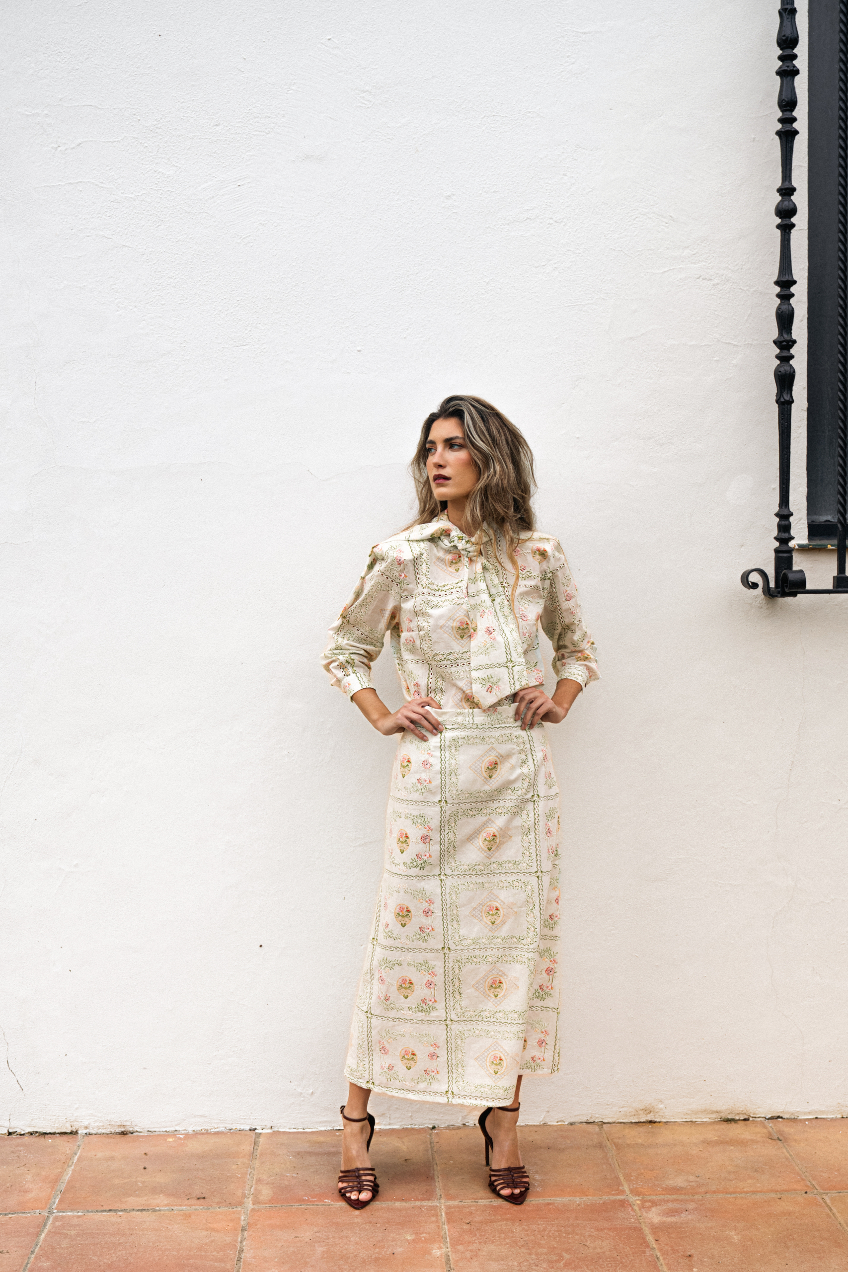 La Falda Brisa incorpora una cremallera oculta en la costura, que asegura un acabado limpio y discreto, manteniendo la armonía del bordado y la pureza de sus líneas.
