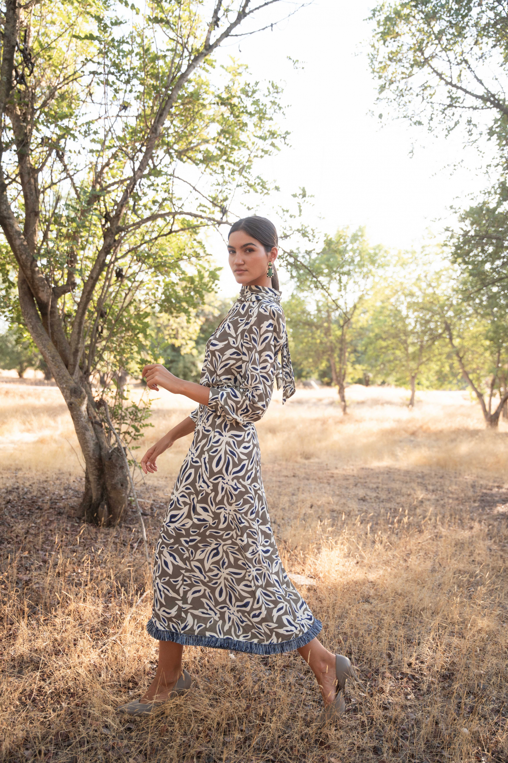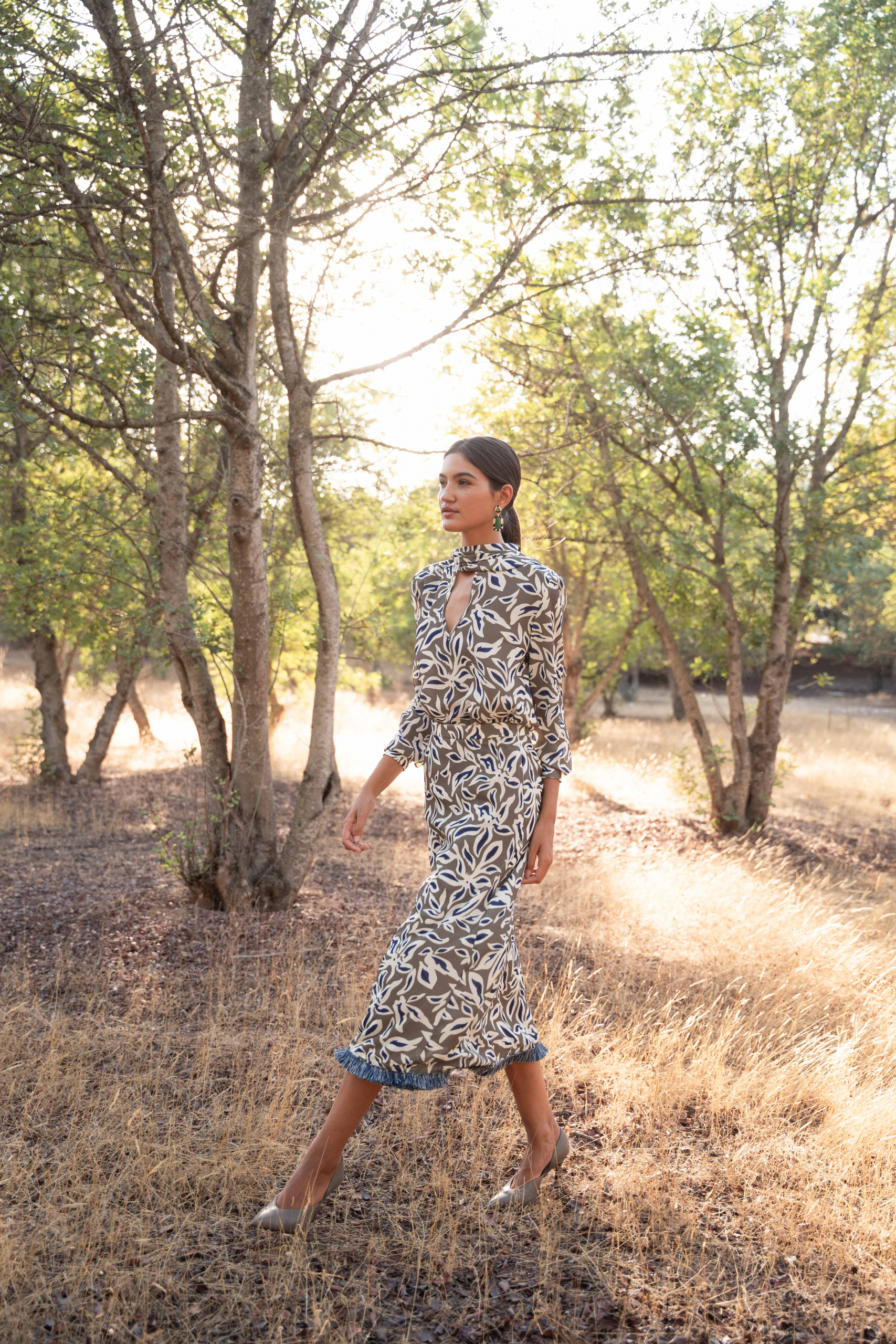 El estampado en gasa refleja el espíritu de la colección: romántico, etéreo y atemporal. Una prenda que se transforma según cómo la combines, capaz de acompañarte en un evento elegante, una cena especial o incluso en tu día a día con las piezas adecuadas.