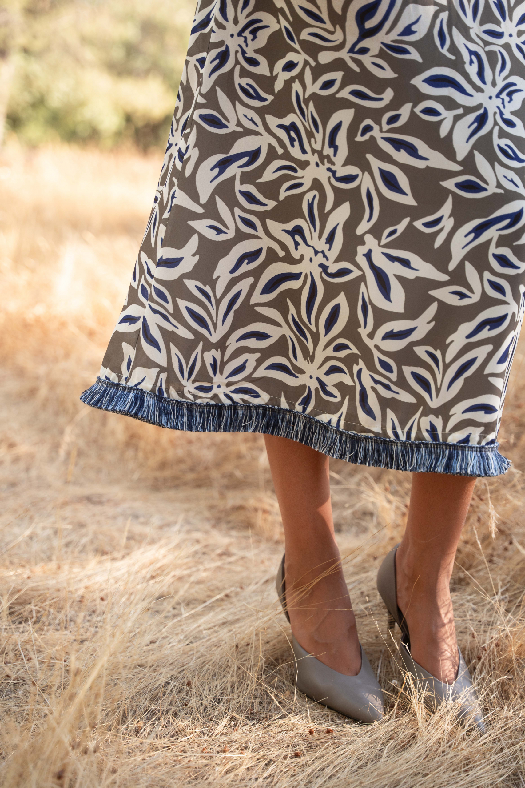 El diseño incorpora una cremallera oculta en la costura, garantizando un acabado limpio y discreto que no interrumpe la delicadeza del estampado. En su interior, la prenda está pensada al detalle: un forro suave aporta confort y opacidad, mientras que los flecos a tono en el bajo añaden un toque inesperado, lleno de gracia y movimiento, que convierte a esta falda en un diseño especial y diferente.