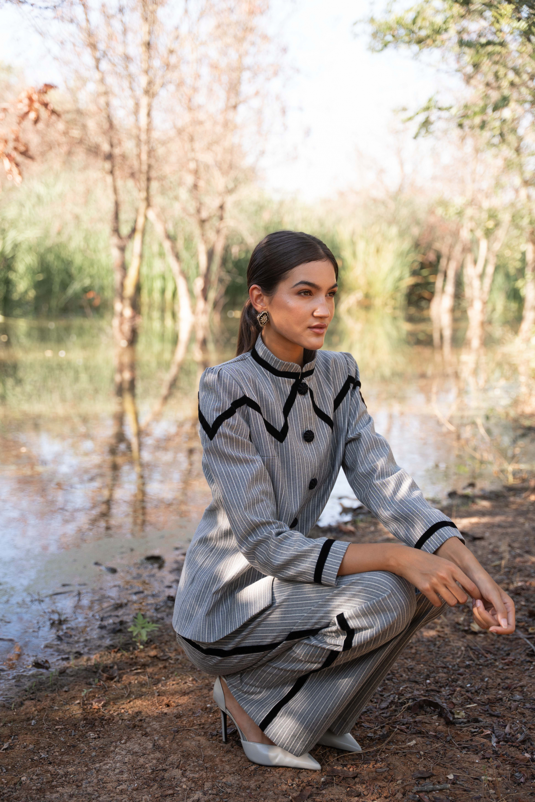235,00€Chaqueta de manga larga en tejido Premium de rayas y cuello mao. Hombreras y forro en su interior. Detalles y adornos en cintas de terciopelo y botones bordados en terciopelo. Combínalo con el pantalón Borgoña.