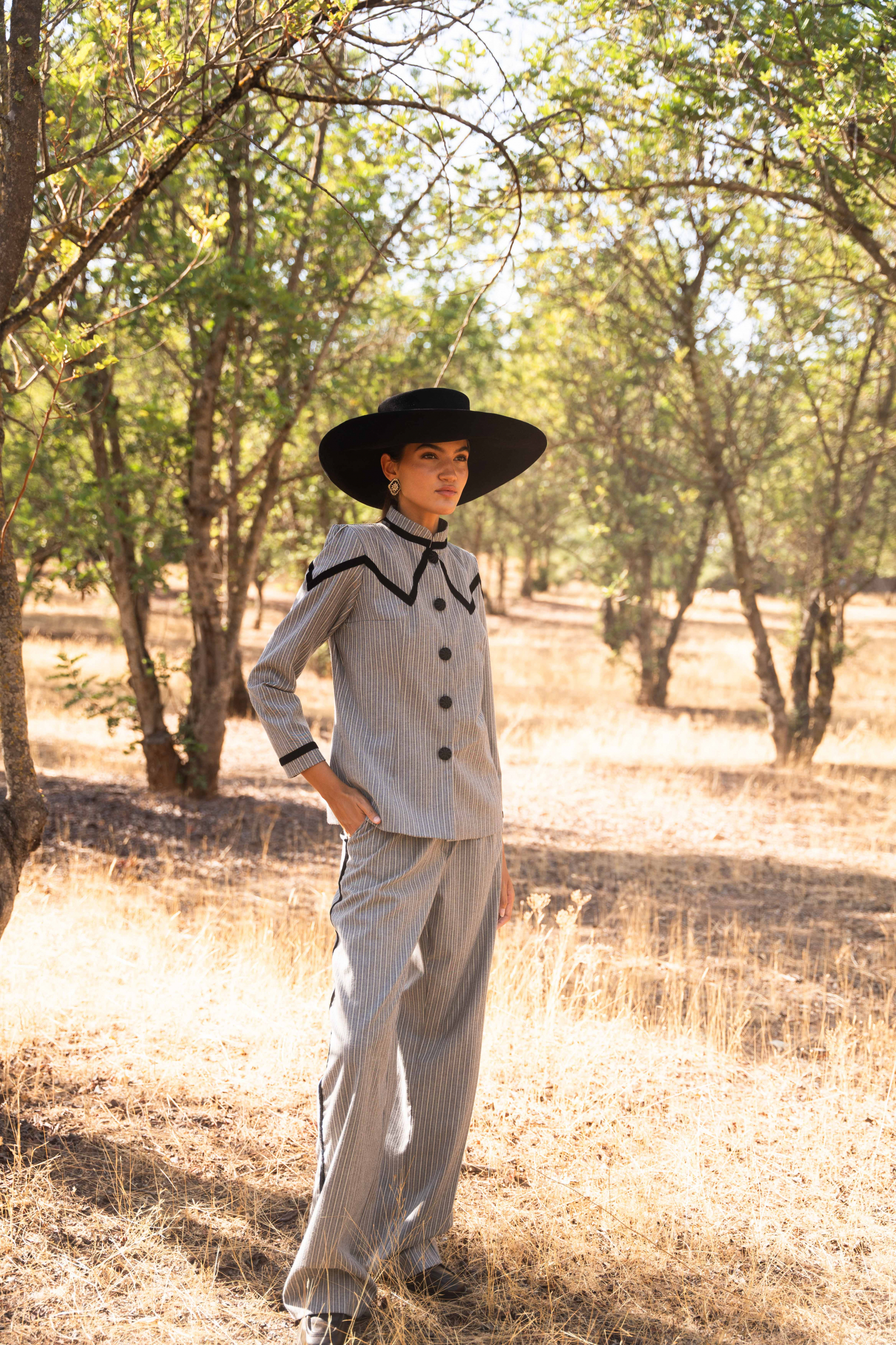 Pantalón de tiro alto en tejido Premium de rayas con trabillas frontales y botones bordados de terciopelo. Pinzas en delantero, pernera ancha con bolsillos laterales y cremallera delantera oculta