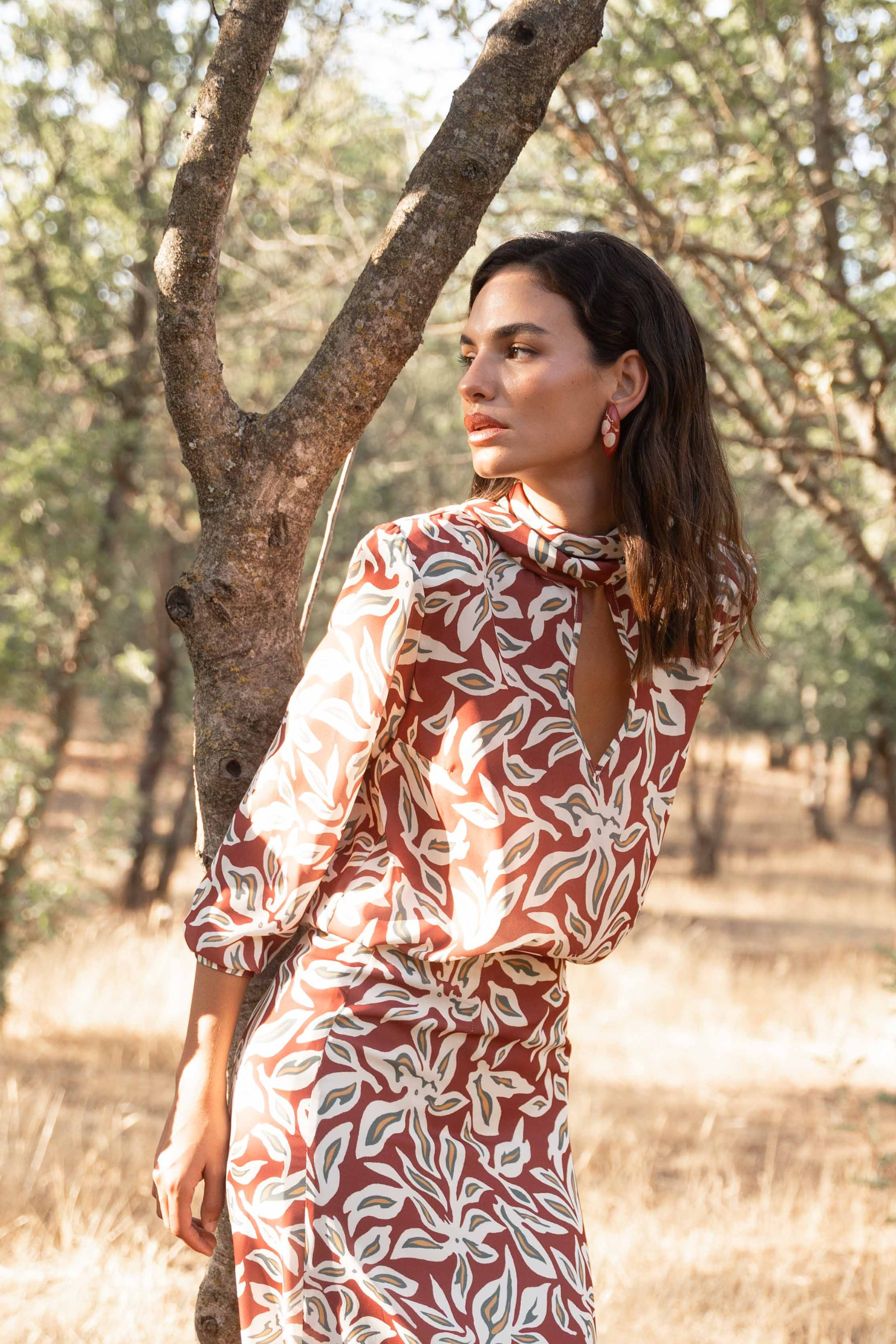 Pendiente en forma de ameba coral coral con flor pintada.Cuidados: no mojar ni rociar con perfume.