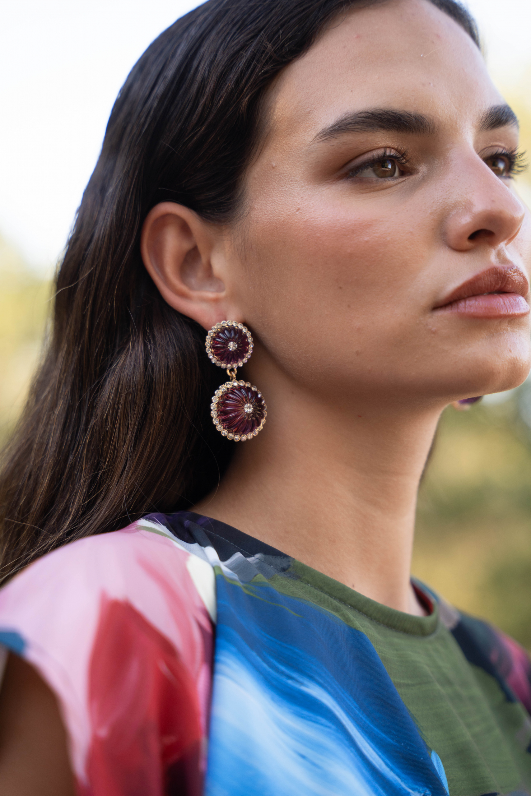 Orginal pendiente estriado color berenjena y cristal. Miden 6 cm. Cuidados: No mojar, ni rociar con perfume.