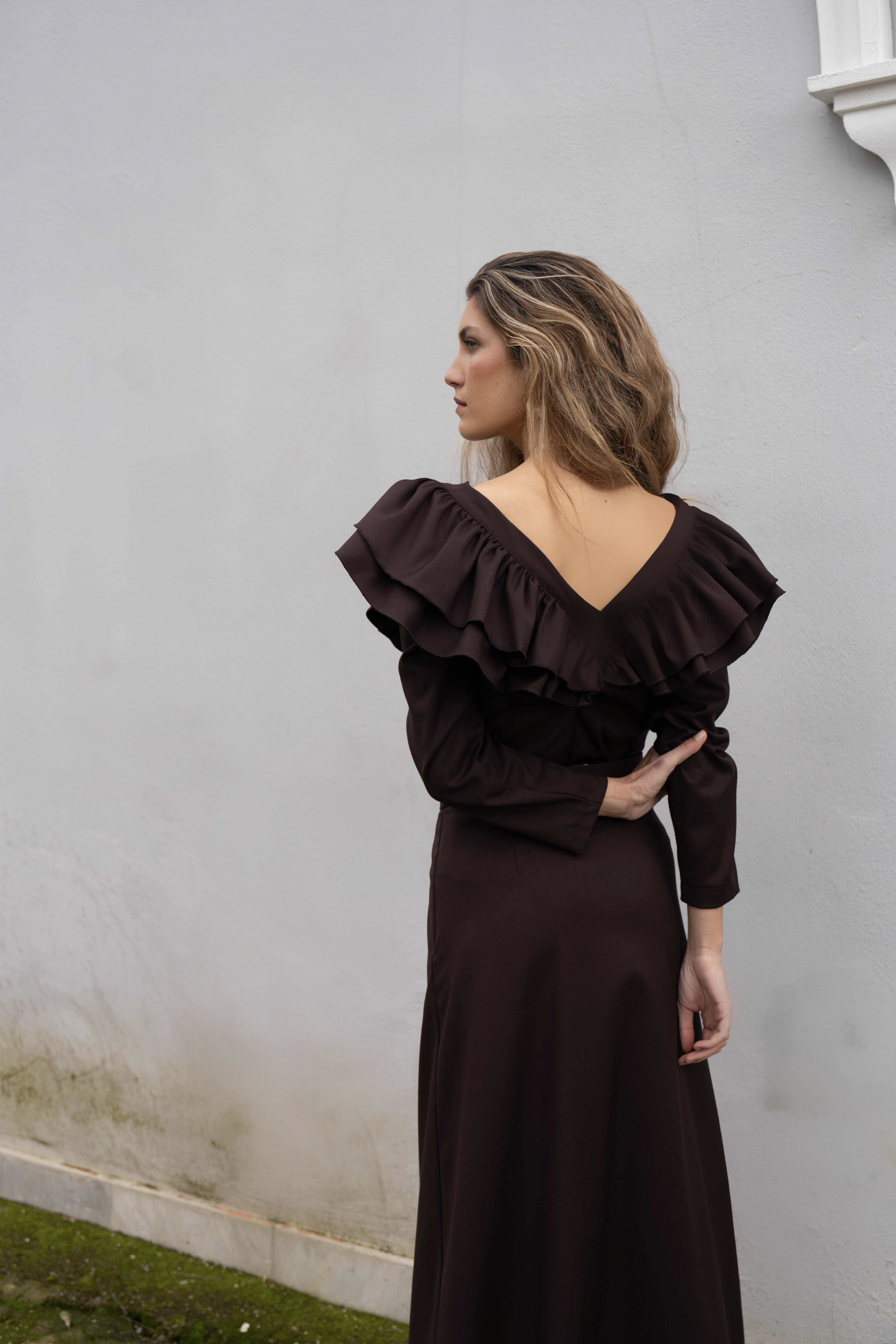 El Top Origen es un top de manga larga entallado, diseñado para combinar elegancia y comodidad. Presenta volantes en delantero y espalda, que aportan un detalle femenino y sofisticado, y un escote en pico tanto en delantero como en espalda, que realza la silueta con un toque moderno. La cremallera oculta en la espalda garantiza un cierre discreto y un acabado limpio.