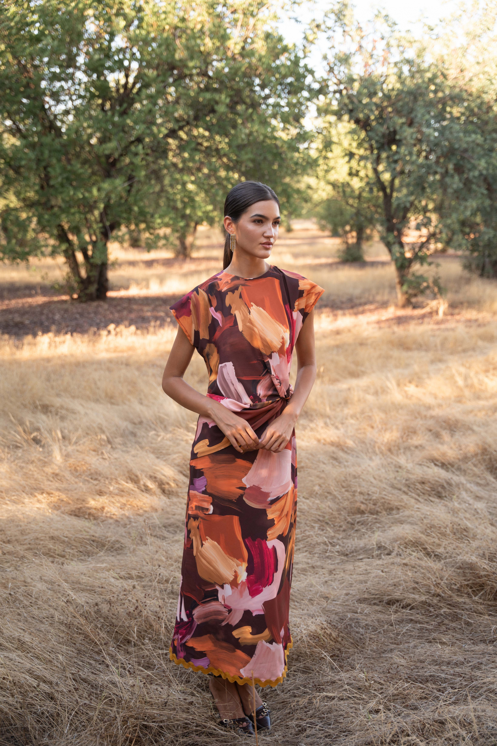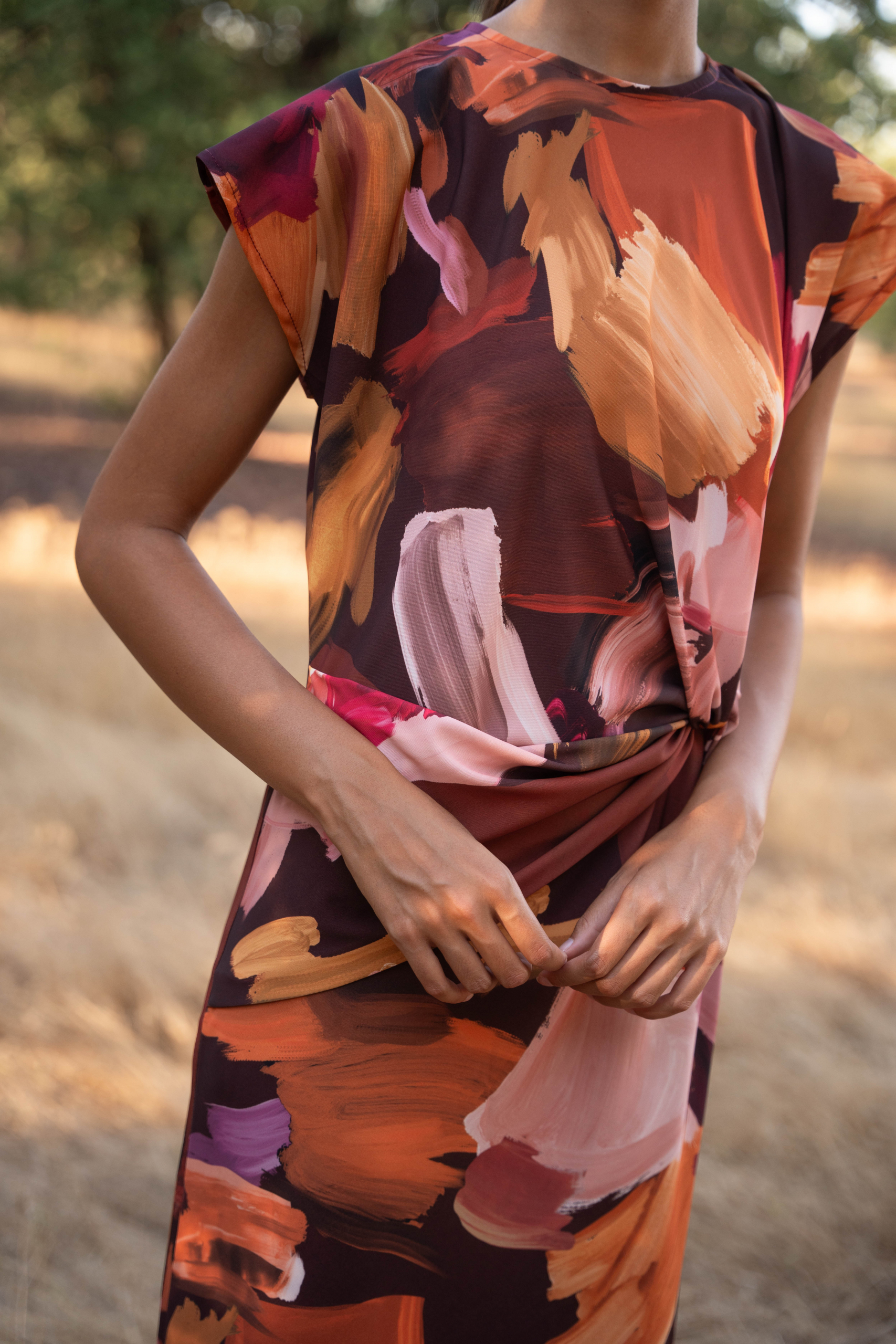 Vestido asimétrico de largo midi, cuello a la caja. Original nudo en la cintura que estiliza la silueta, manga corta. Botón en espalda y bajo rematado con piculina a tono.